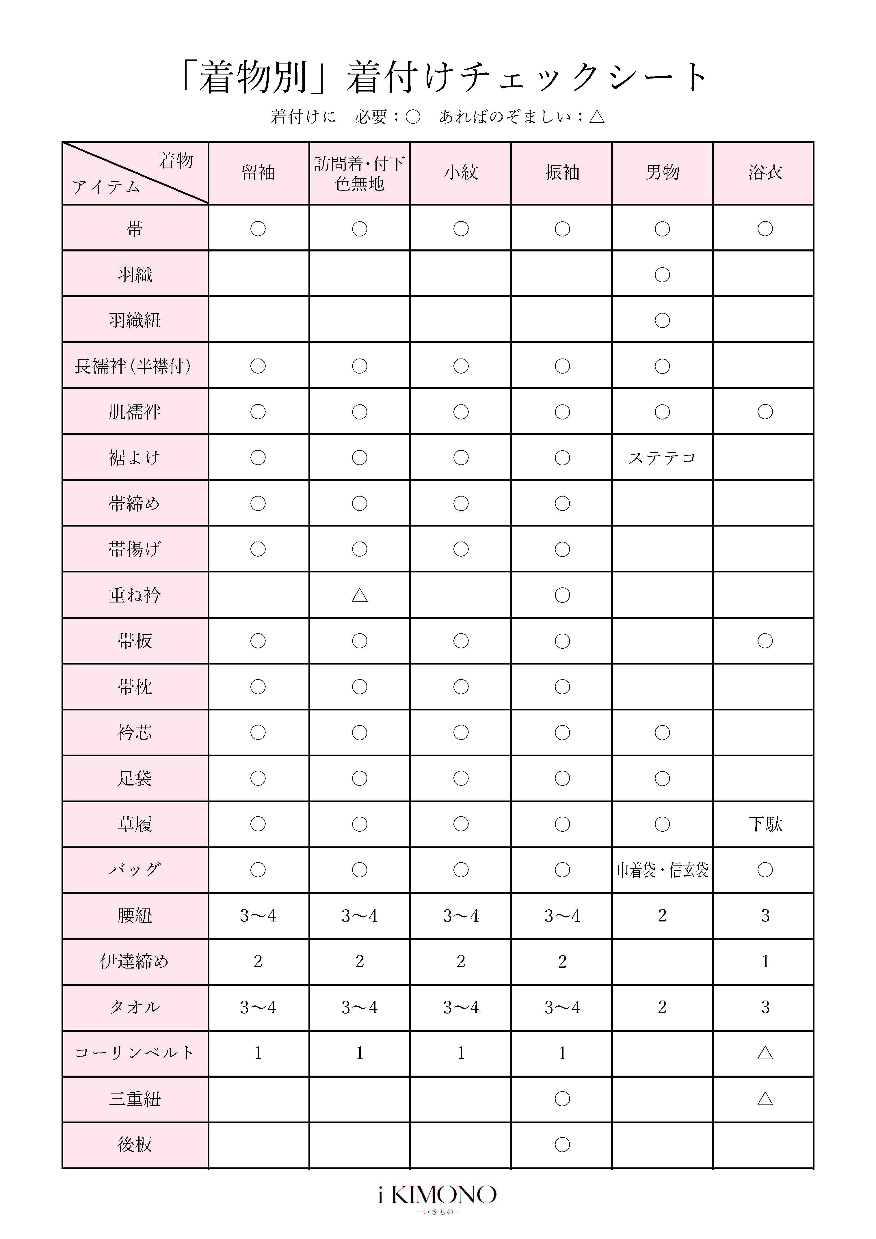 着物の種類(振袖・訪問着・小紋など)によって、必要なアイテムは少しずつ異なります。以下のチェックリストを参考に、不足しているものがないかを確認してみましょう。